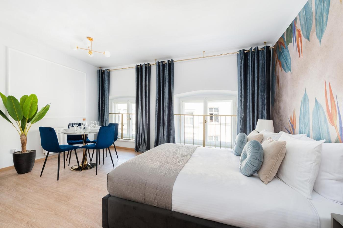 Studio typu Deluxe z łóżkiem typu queen-size. The studio features a private bathroom, a washing machine, a private entrance, as well as a seating area with a flat-screen TV. Meals can be prepared in the well-fitted kitchenette, which is equipped with a stovetop, a refrigerator, a dishwasher and kitchenware. The studio provides a tea and coffee maker, a dining area, a wardrobe, a TV, as well as city views. The unit offers 2 beds. Studio - 4 osobowy. Powierzchnia pokoju ok.: 35 mkw. ;