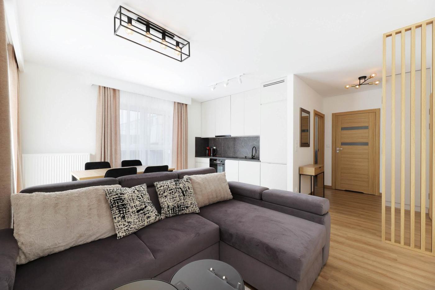 Oferta apartamentu obejmuje sypialnię (1), salon, kuchnię z pełnym wyposażeniem, w tym lodówką i ekspresem do kawy, a także łazienkę (1) z prysznicem oraz suszarką do włosów. W apartamencie zapewniono ręczniki i pościel.